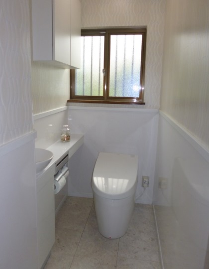真っ白で清潔感あふれるトイレにリフォーム手洗いカウンターと収納を取付けてスッキリしました。