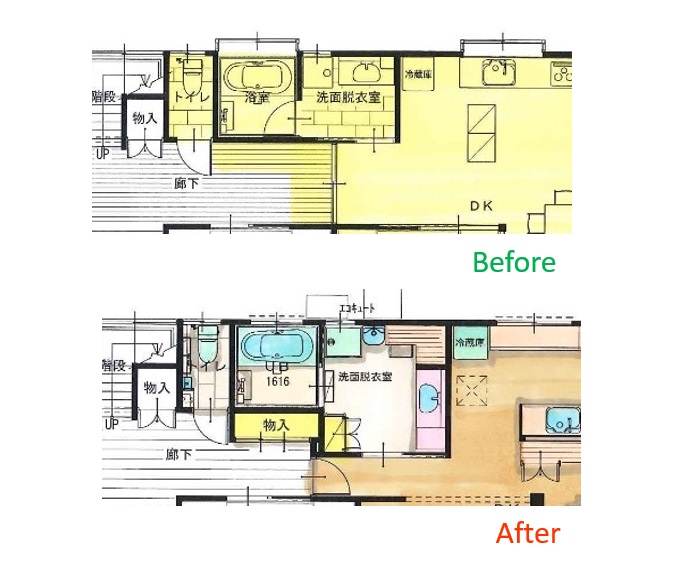 4.5帖の洗面室には、化粧カウンター・衣類収納タナ・を設置し、お風呂上りの身支度が完結できるようにリフォーム。