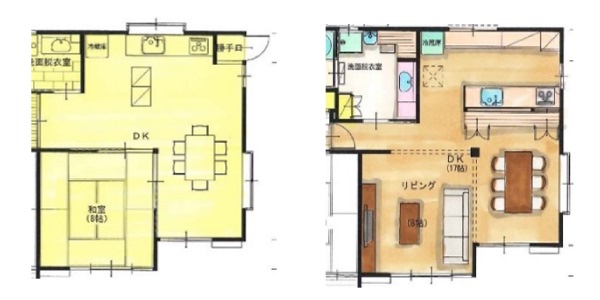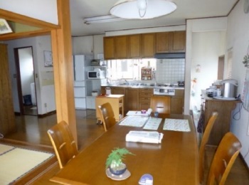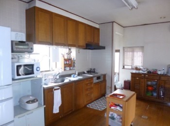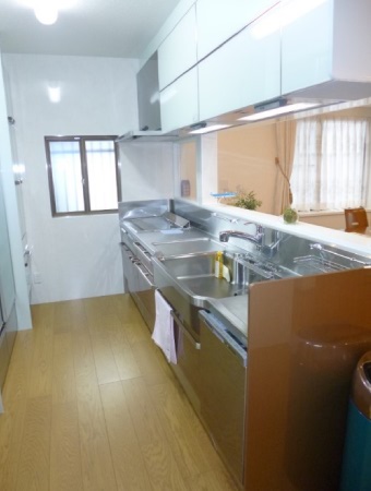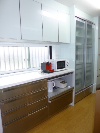 キッチン・収納の2列の配置で収納性・作業効率がアップのキッチンエリア。ダイニング側は、奥様の作業コーナー兼ご主人様のパソコンエリアとして利用