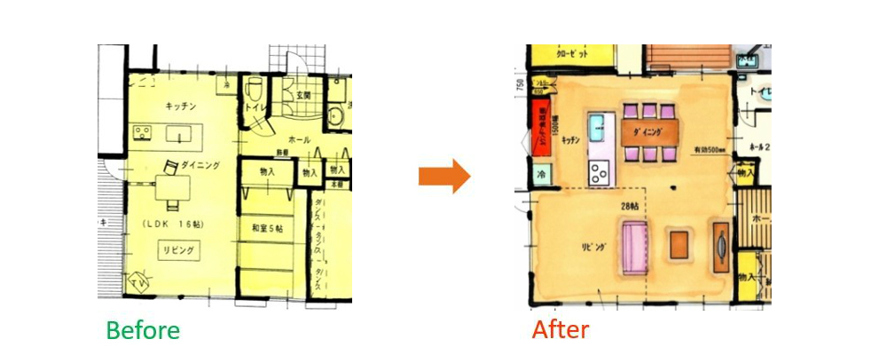 間取りの大幅変更でド〜ンと広いLDKにリフォーム。