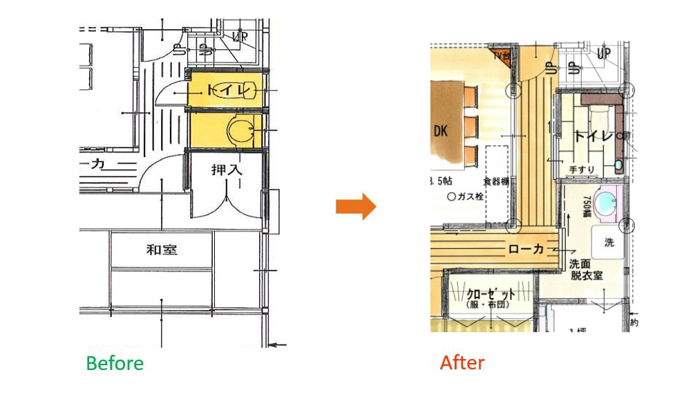 洗面部分と接続して広いトイレルームに改装