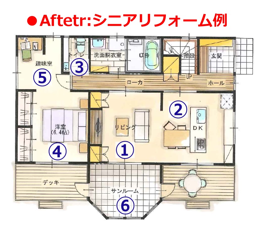 ご夫婦一緒に料理を楽しみ、会話が弾む対面キッチン。キッチンの向こう側はリビングになっており、孫が来たら、みんなで料理を食べながら団らん。 よごれが目立っていたトイレをリフォームし、手すりも付けて安全に。 1階に落ちついた雰囲気の寝室を配置し、楽な動線に。クローゼットも取り付けて収納も充実。 寝室の奥にご主人の趣味のスペース、ゆっくり趣味に没頭する時間もたまには必要ですね。 時には友達を呼んで、サンルーム・デッキまで開放しホームパーティーなんかも楽しいですね。また、ペットスペースとしてご利用してもいかがでしょうか?